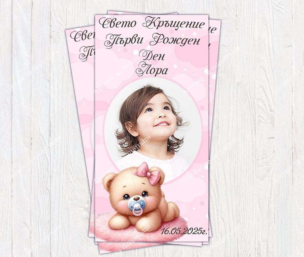Добавете нежност и чар към празника с нашите етикети за бутилки с дизайн “Мече в розово” – идеалният финален щрих за кръщене, първи рожден ден или бебешка погача!