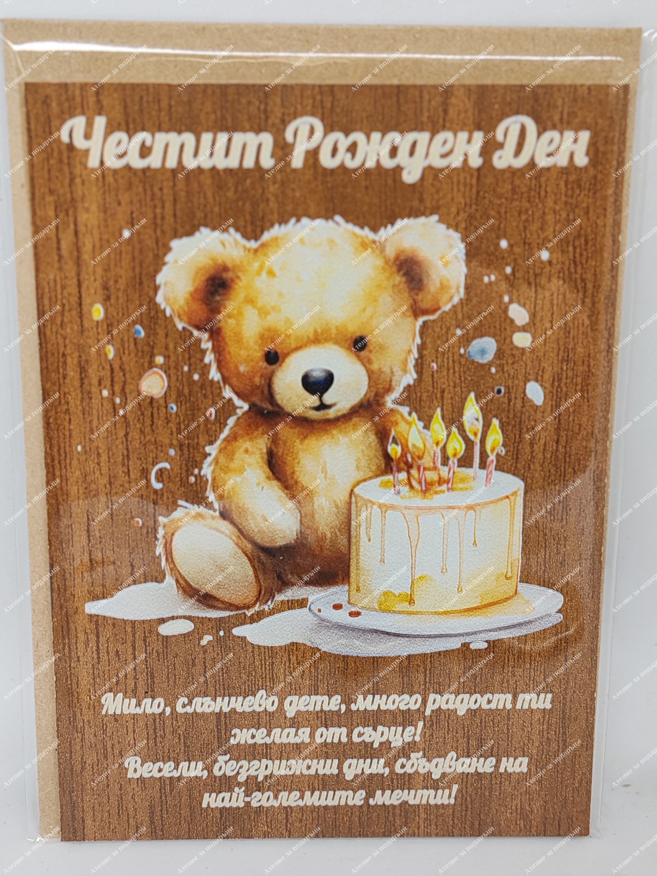 Тази красива дървена картичка за рожден ден за дете е създадена, за да донесе усмивки и радост. На лицевата част е изобразено малко сладко мече, което носи топло настроение и прави картичката още по-очарователна.