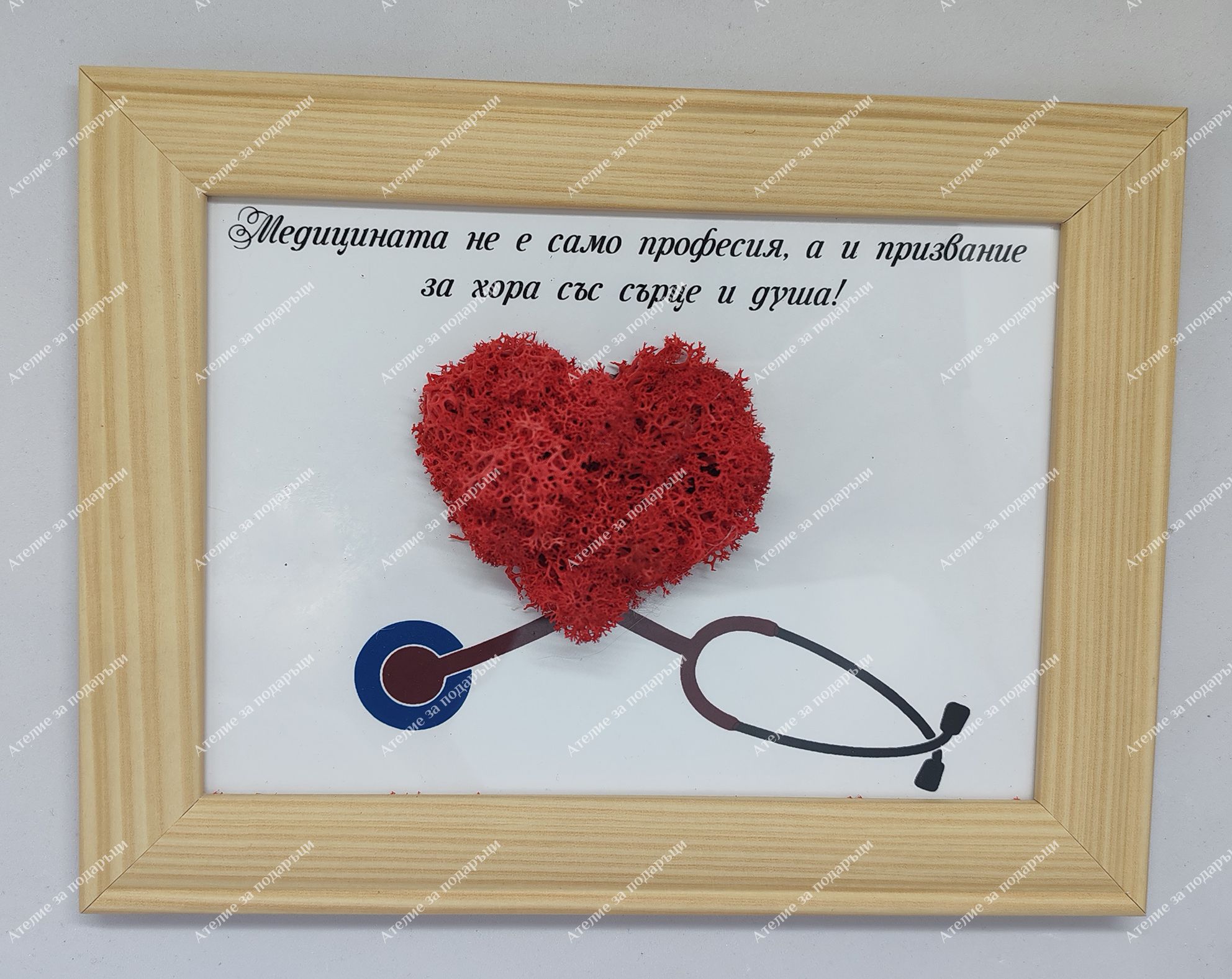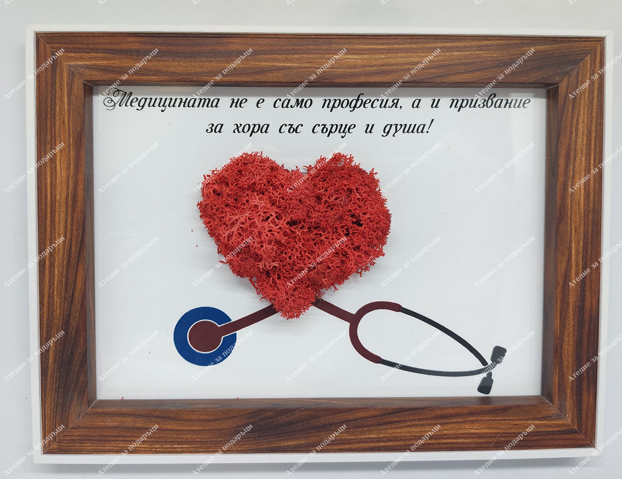 Дизайн, Който Докосва Сърцето: В центъра на картината е изящно изобразено стилизирано изображение на стетоскоп, чиято слушалка завършва с нежно оформено сърце от скандинавски мъх. Този символичен дизайн е перфектната метафора за грижата, отдадеността и любовта, с които лекарите се борят за човешкото здраве. Стабилизираният скандинавски мъх е 100% естествен, не изисква поддръжка, поливане или слънчева светлина, като същевременно помага за регулиране на влажността на въздуха