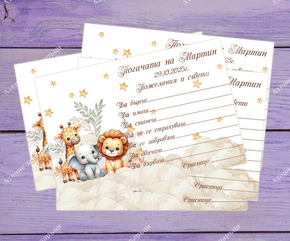 Нашите карти за погача на бебе със сладки животни са създадени с много любов и внимание към детайла, за да направят този специален ден още по-вълшебен. Всяка карта е с изображения на сладки животни – лъвче, слонче и жирафче, стъпили на пухкави облачета, заобиколени от нежни звездички. Тези карти за орисване на бебе са идеалният начин да съхраните най-топлите пожелания от Вашите близки и приятели.