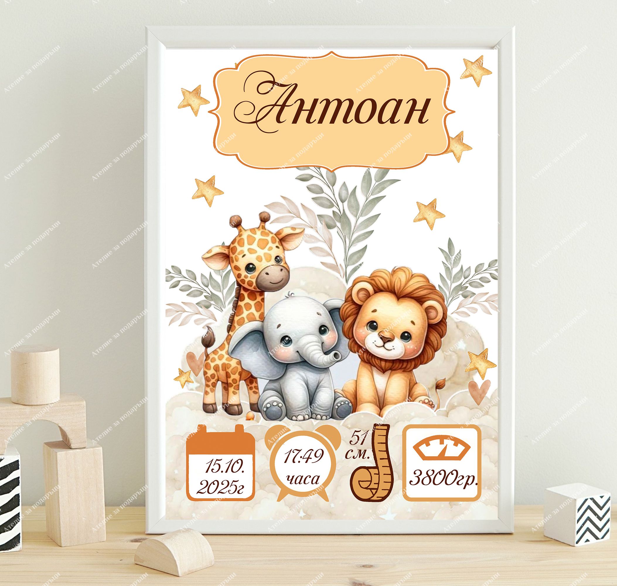 Подарете стилен и емоционален спомен с нашия бебешки постер „Сафари животни“ – перфектният избор за подарък за новородено, подарък за бебе, подарък за погача или рожден ден.