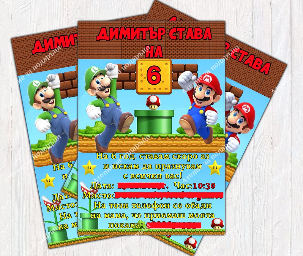 Поканите са създадени в духа на популярната игра – ярки, красиви цветове, забавни елементи и оригинално изображение на Марио и Луиджи, което веднага създава настроение. Гарантирано предизвикват усмивки и пренасят Вашите гости директно в Кралството на Гъбите.