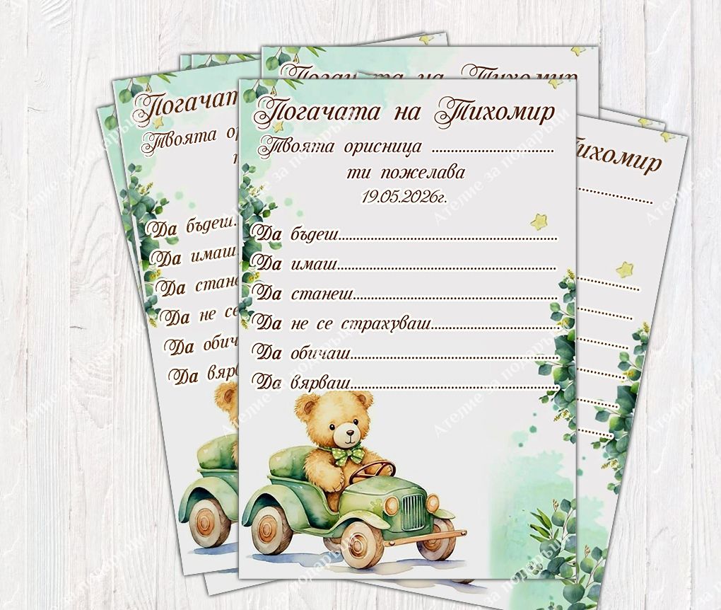 Първият празник на вашето бебе заслужава детайли, които остават за цял живот. Нашите карти за погача "Мече с кола" са създадени да съберат най-чистите пожелания и орисвания от вашите орисници по един оригинален и емоционален начин. Стилни, нежни и оригинални карти за орисване на бебе, създадени с много внимание към всеки детайл.