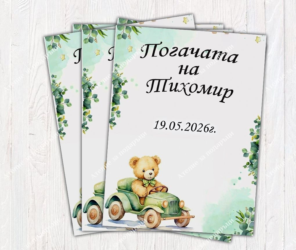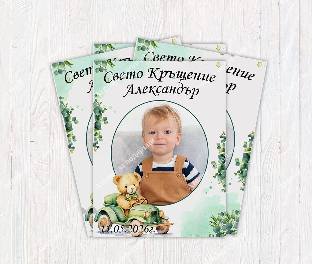 Запазете най-красивите моменти от празника с нашите стилни и нежни персонални магнити Мече с кола – оригинален подарък и прекрасен спомен за гости и близки.Със своята нежна зелена гама и приказен дизайн, те са подходящи за всяко важно събитие в живота на вашето дете.